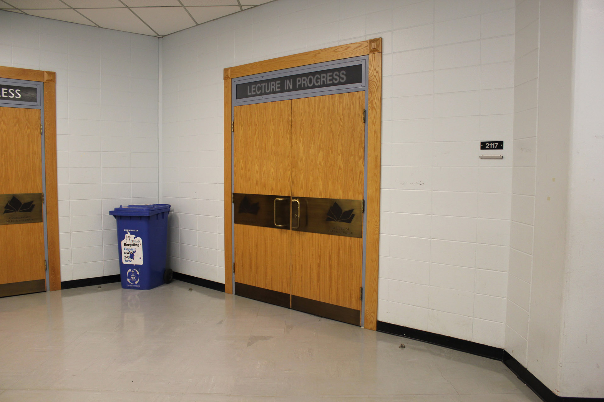 On entering the building walk straight towards the stairway doors on the left. Enter the stairway.