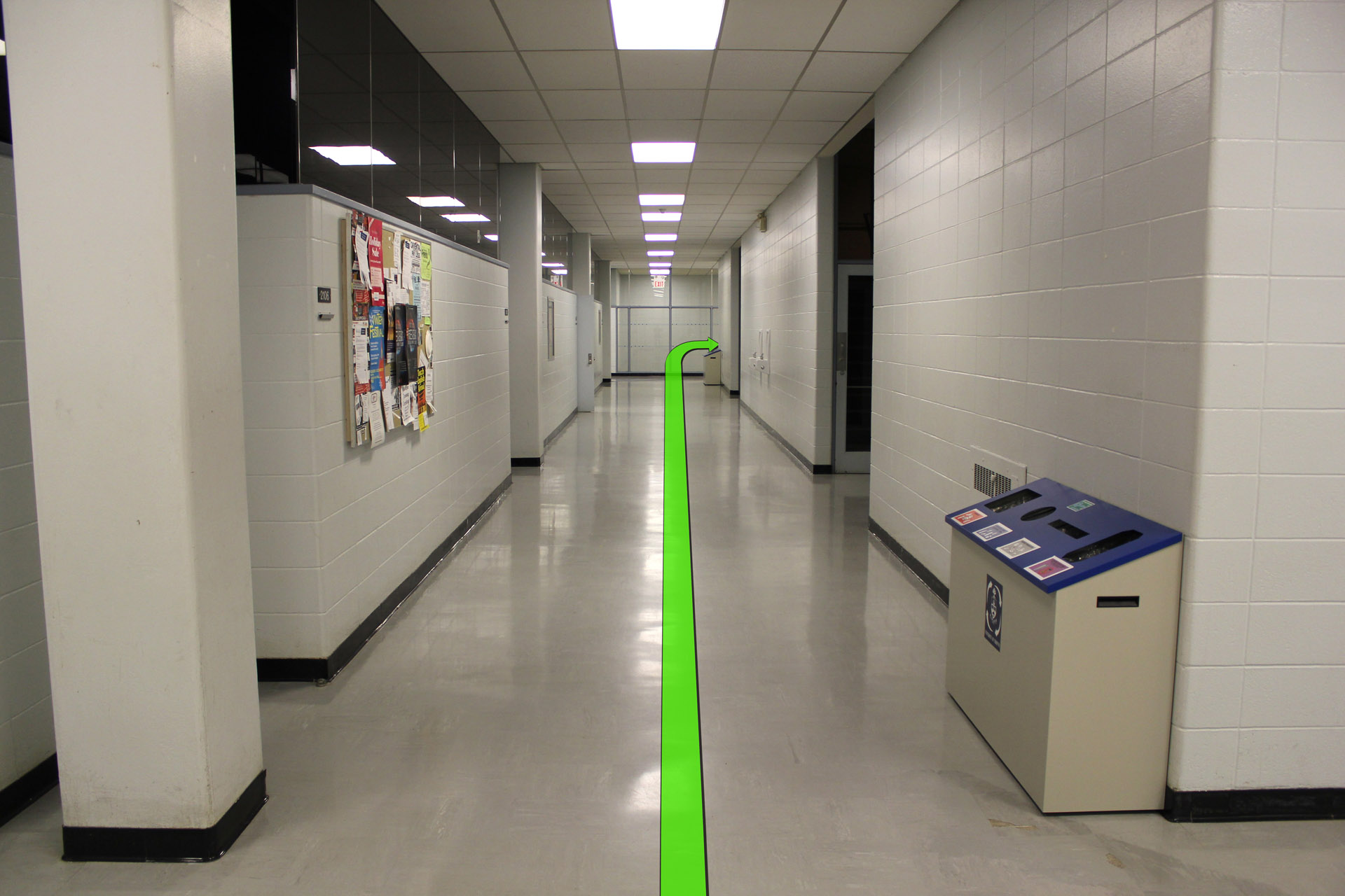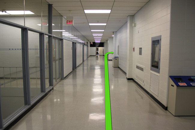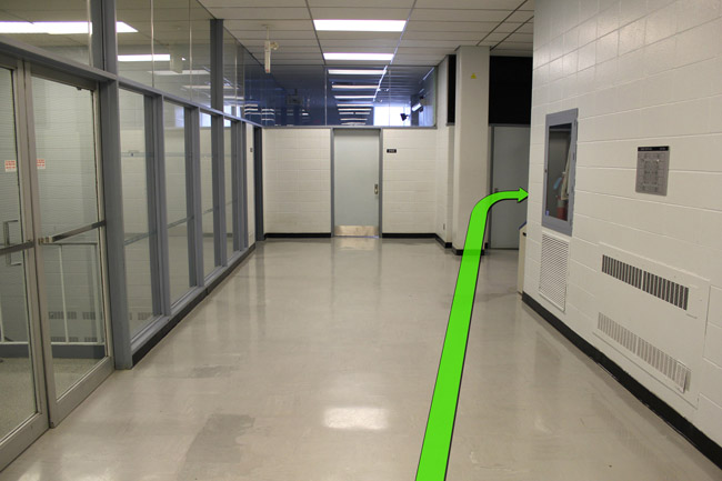 Walk straight down the hallway and take a right turn at the end of the hallway.
