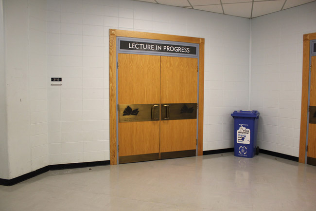 On entering the building walk straight towards the stairway doors on the left. Enter the stairway.