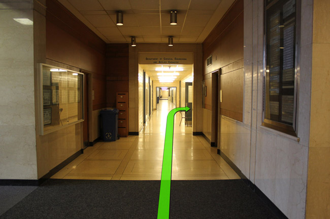 Walk straight down the hallway towards your room on the right.