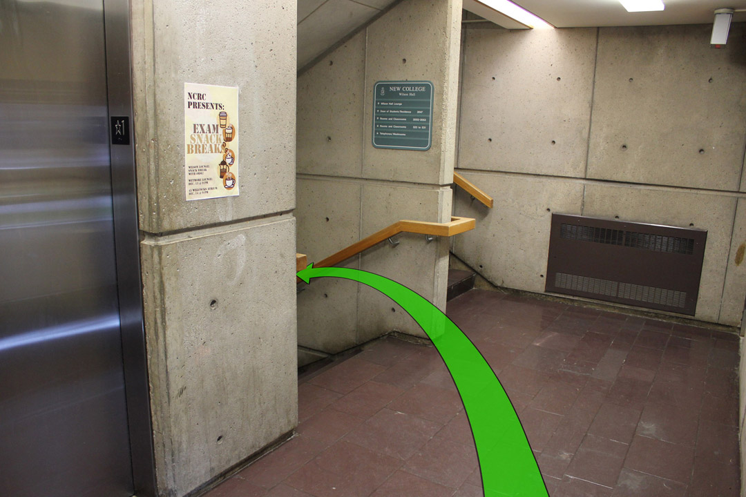 Walk from Spadina Avenue down Wilcocks Street towards the entrance of New College, Wilson Hall up on the left.