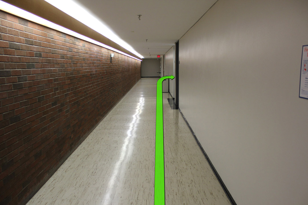 On entering the hallway take a left turn down the next hallway.