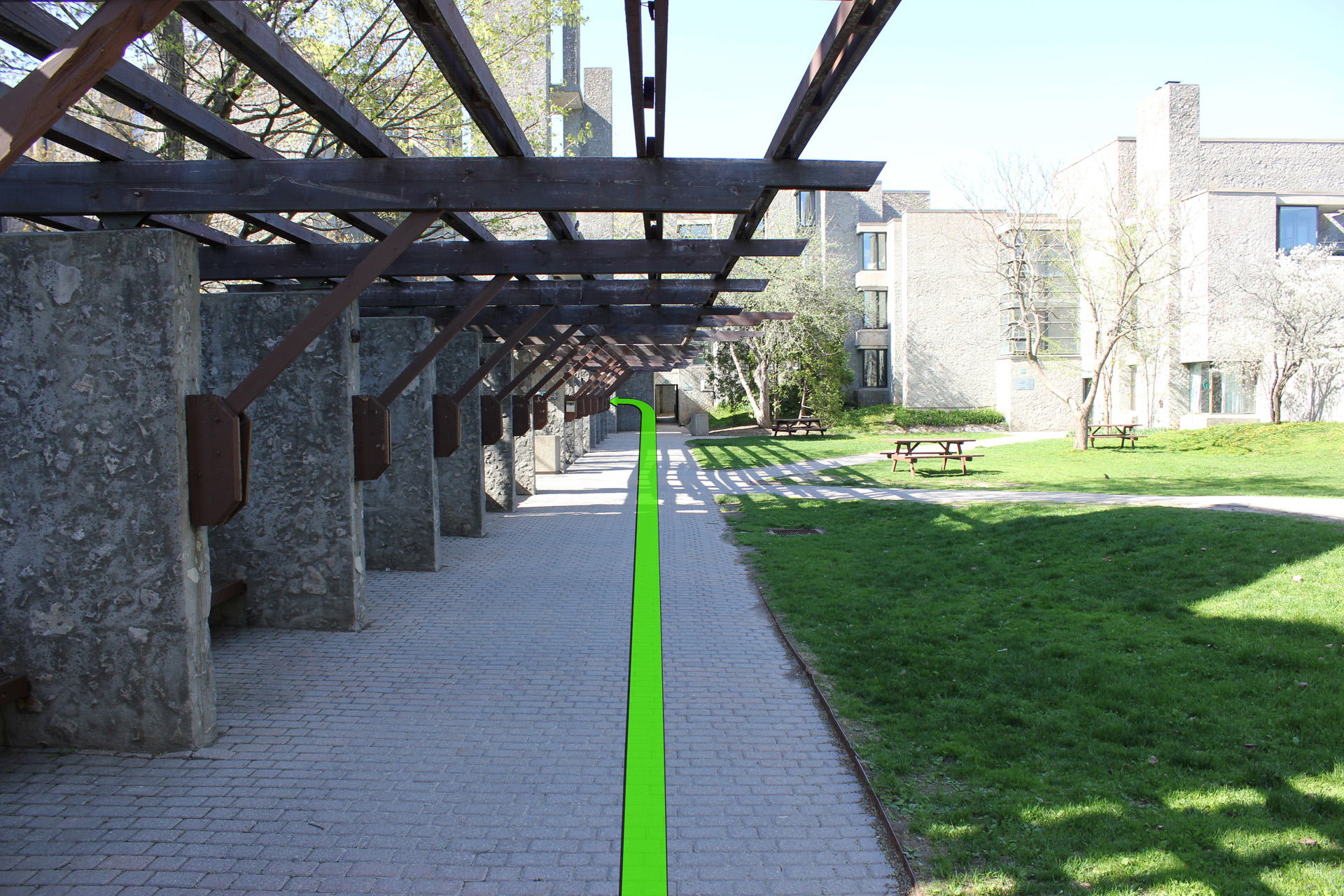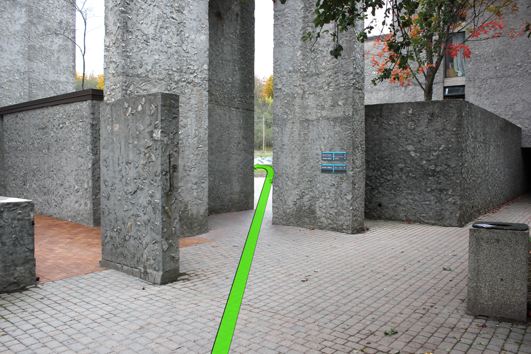 Take a right up ahead between the two Champlain buildings.
