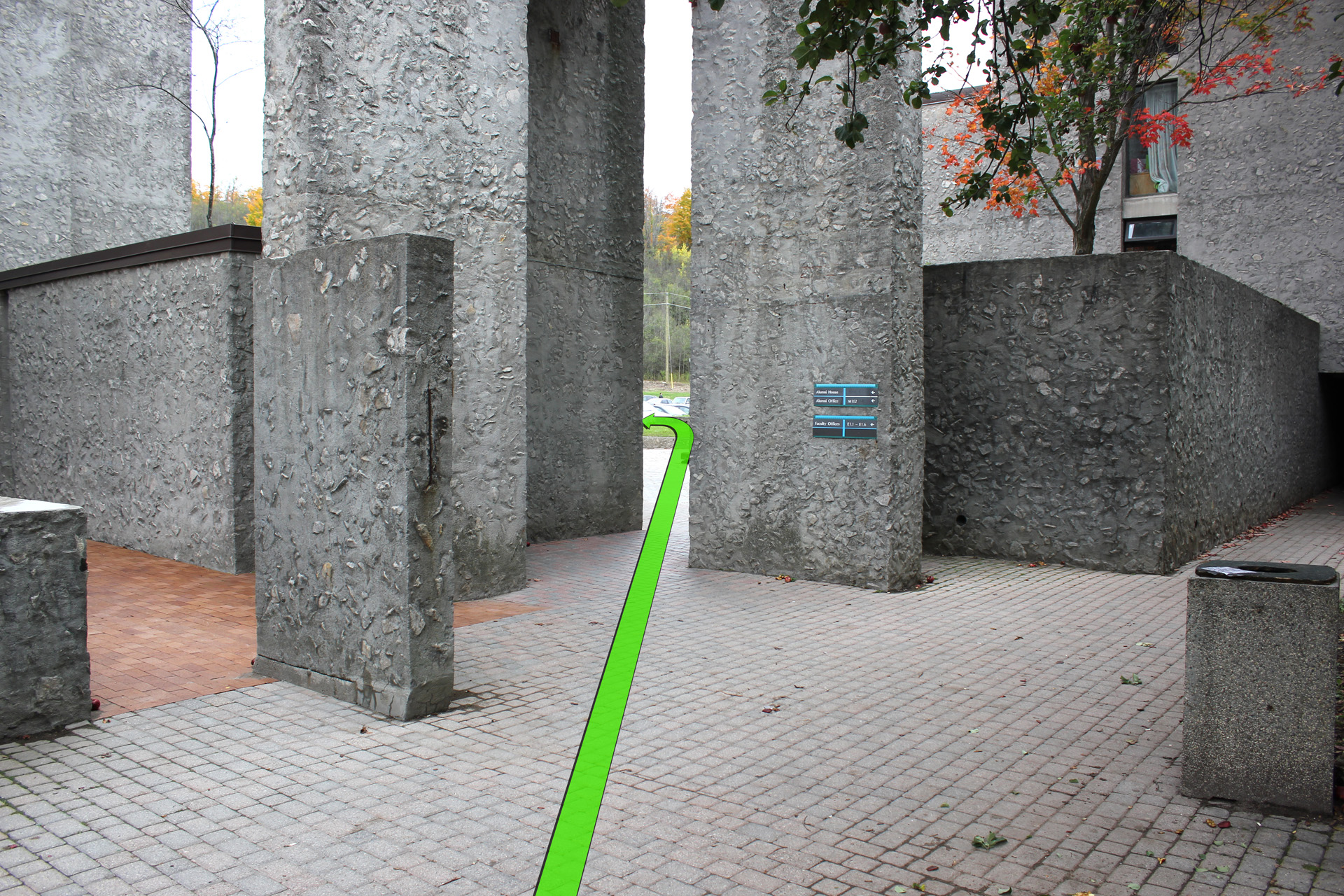 Keep walking straight and then take a left turn up ahead at the pillars.