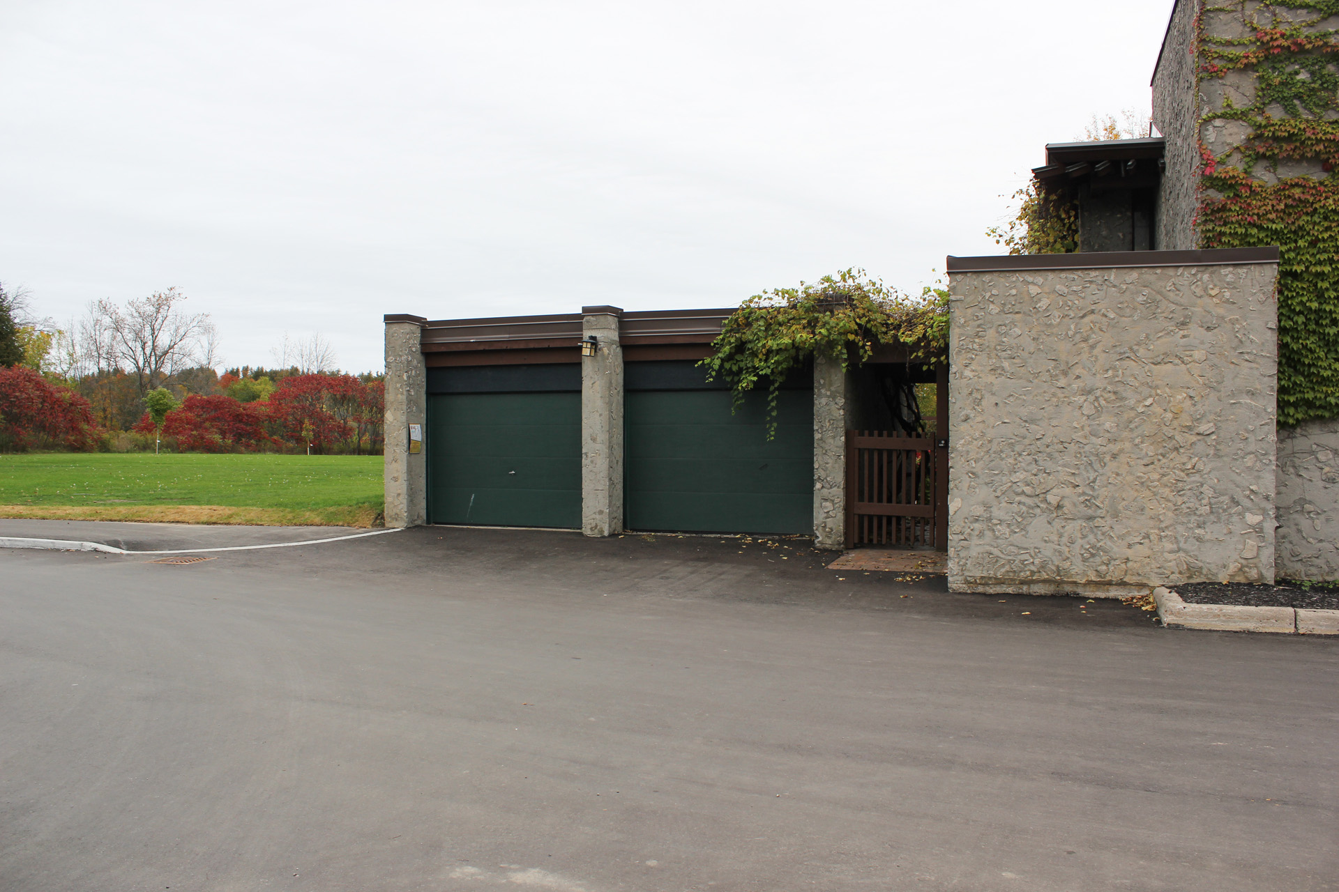 Walk straight and take a right turn at the garage up ahead.