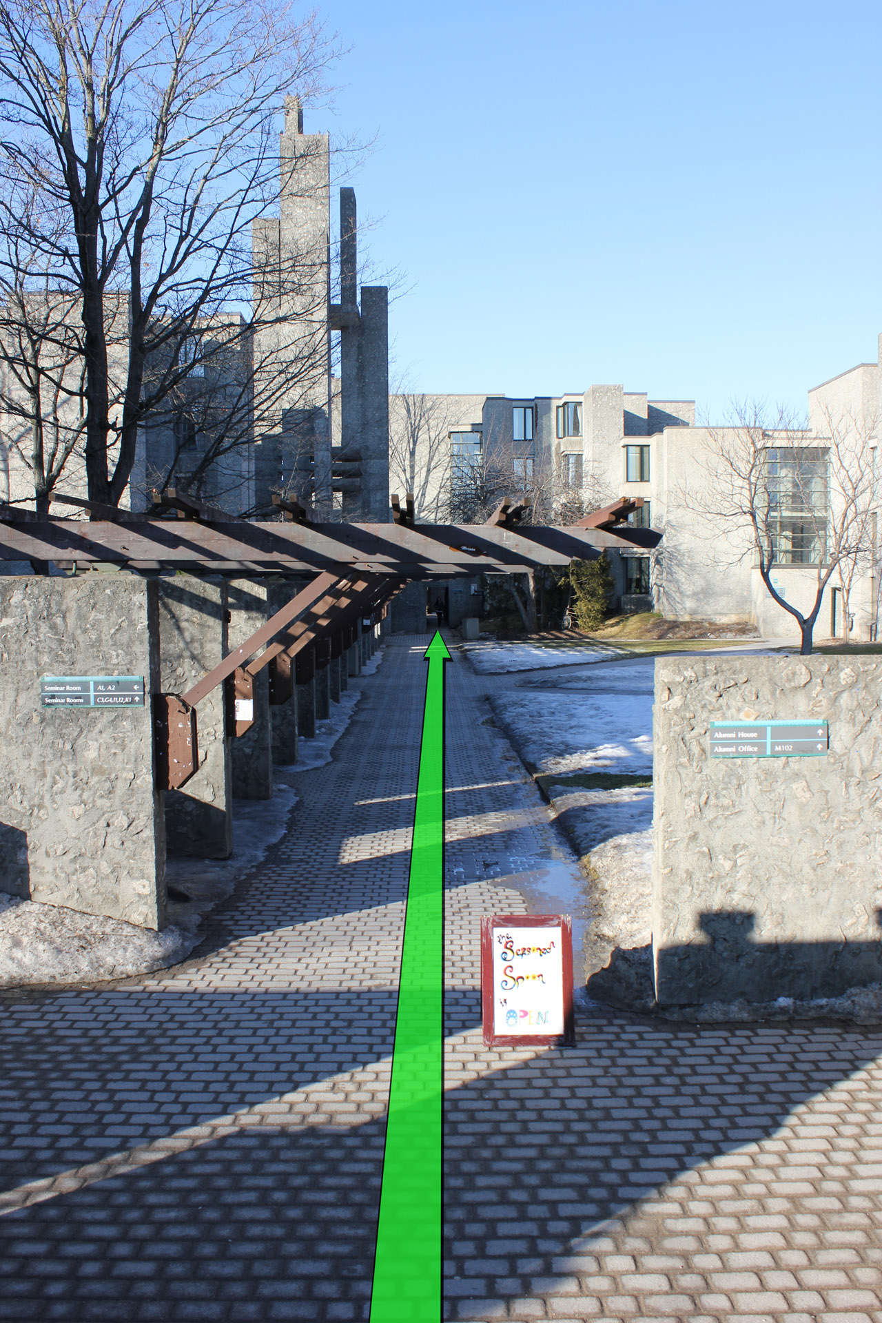 Take a right up ahead between the two Champlain buildings.