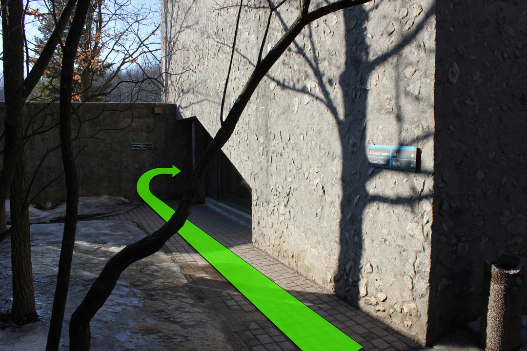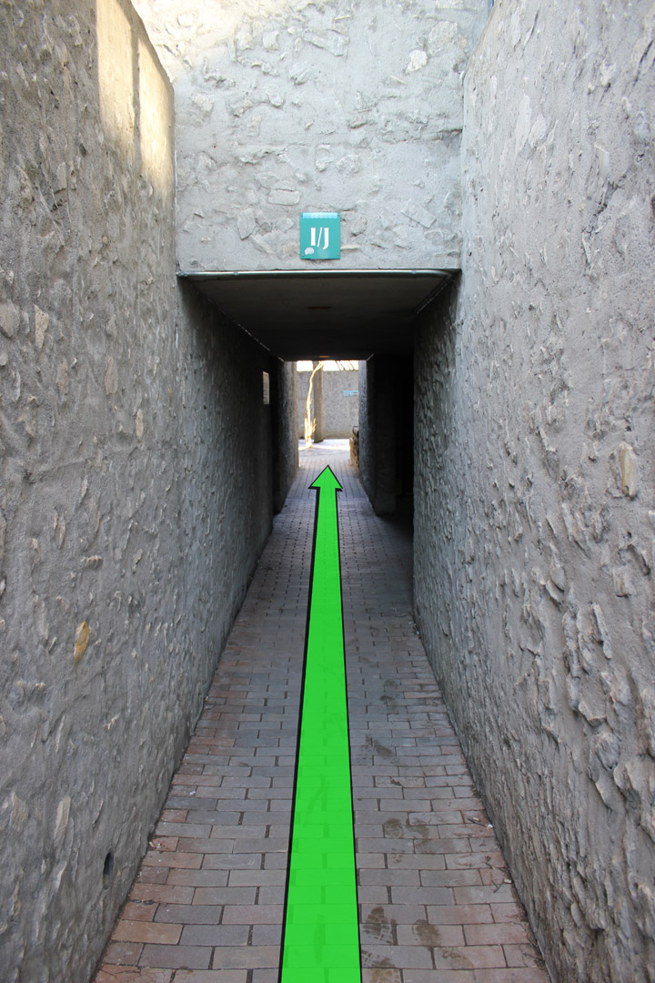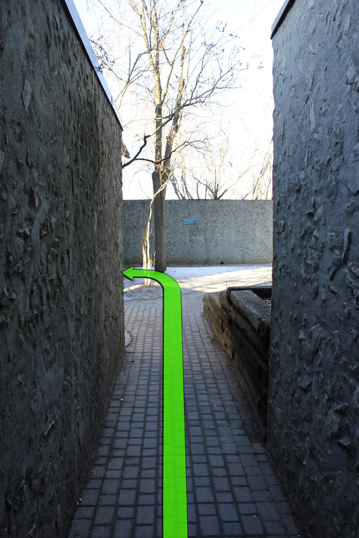 Walk down the pathway and open the door on the right.