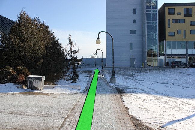 Walk straight down the pathway towards Gzowski College.
