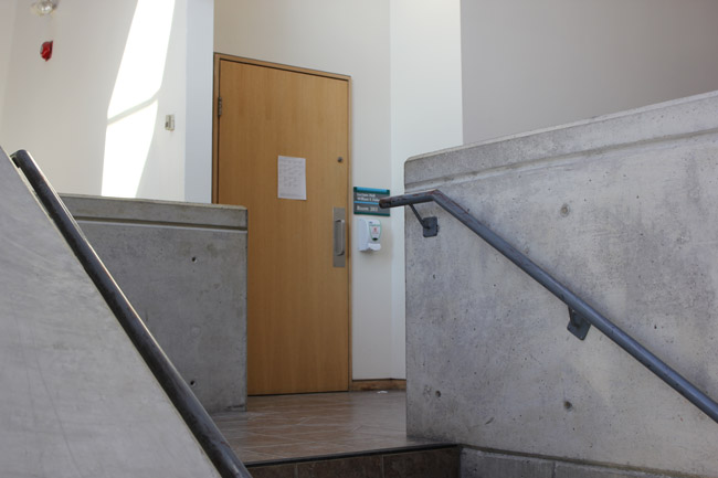 Walk towards the entrance door and enter the building.