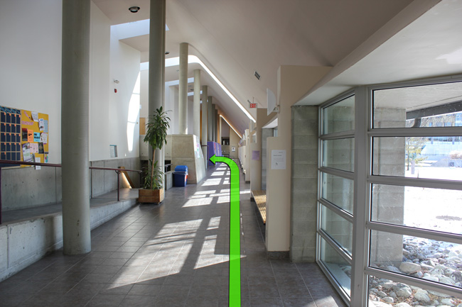 As you reach the end of the pathway take a right turn towards the Otonabee College Entrance.