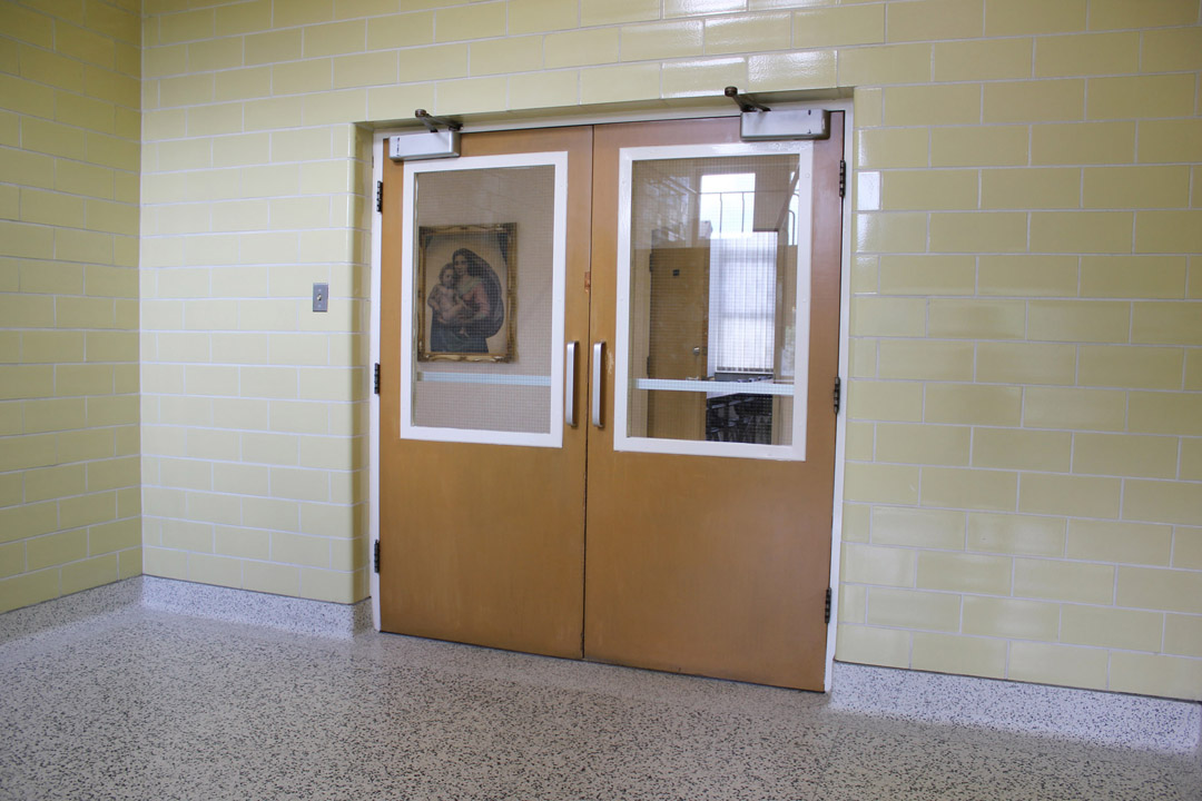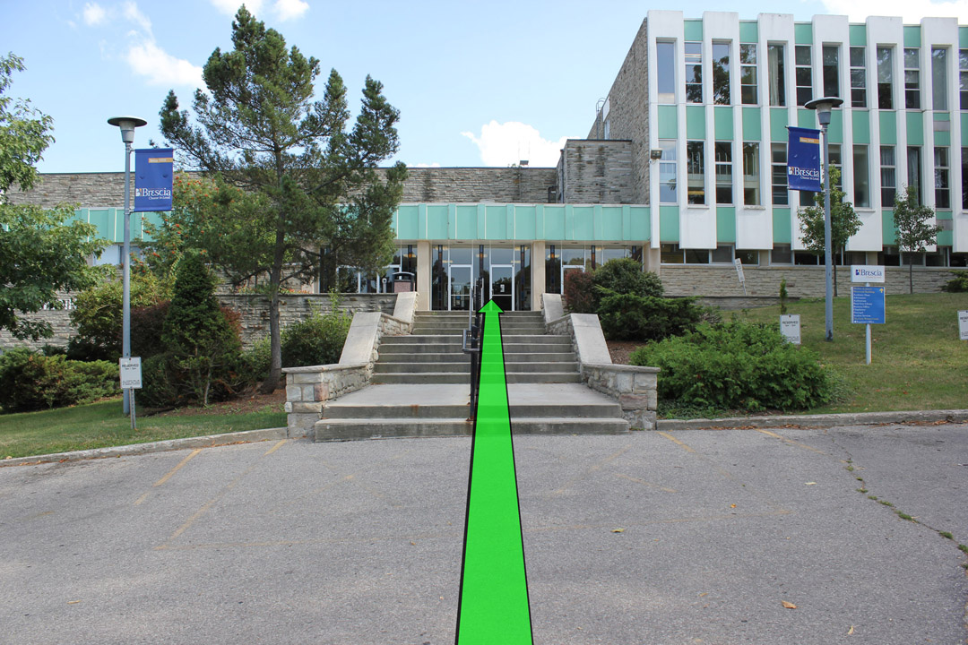 Walk from the parking lot towards the entrance of the Mother St. James Building.
