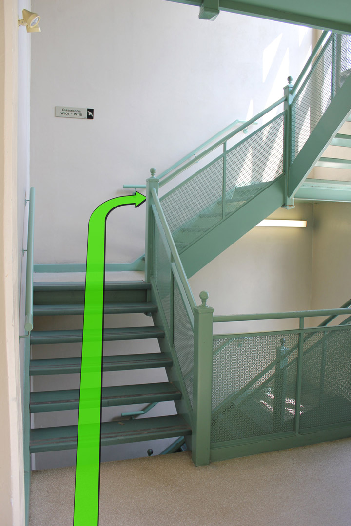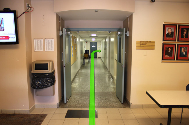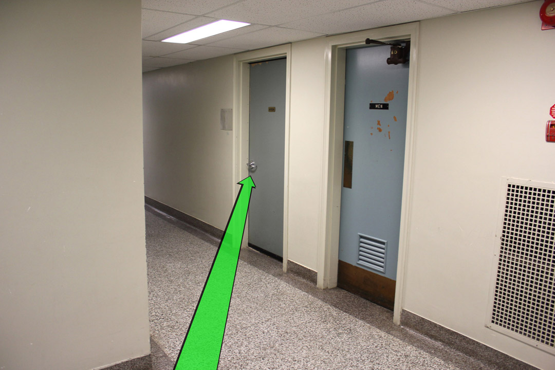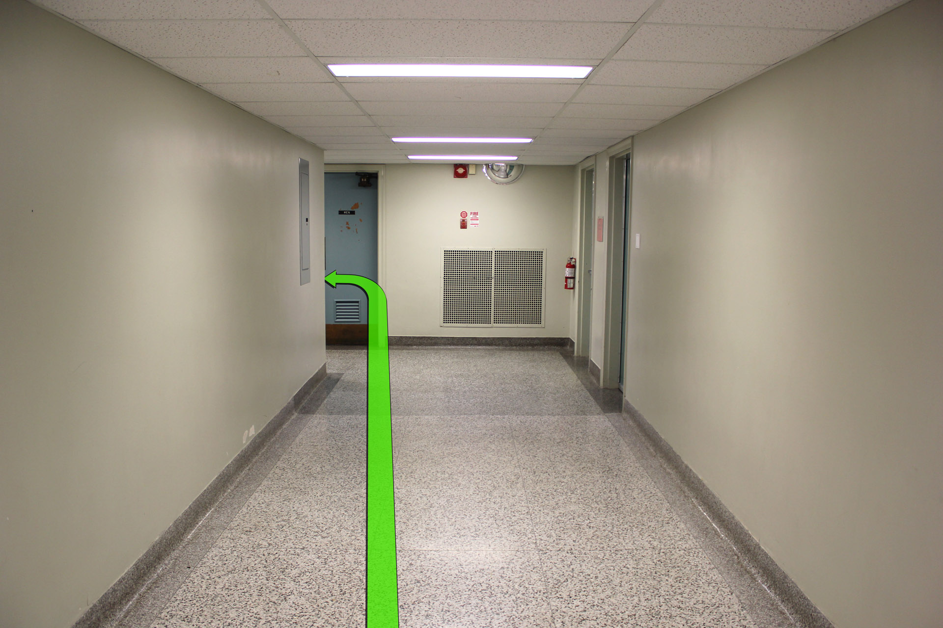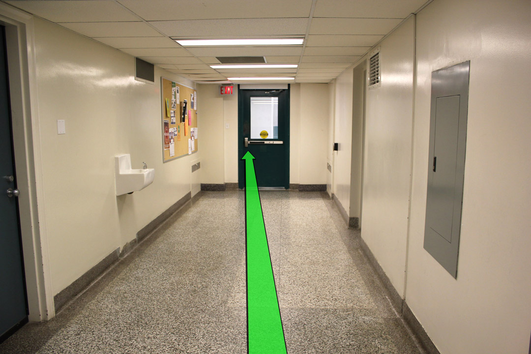 Walk straight down the hallway and take a left turn at the end of the hallway.