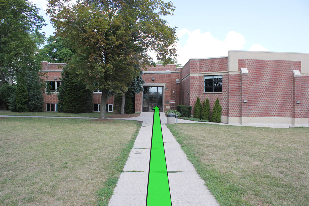 Walk straight down the pathway on your right towards the entrance up ahead.